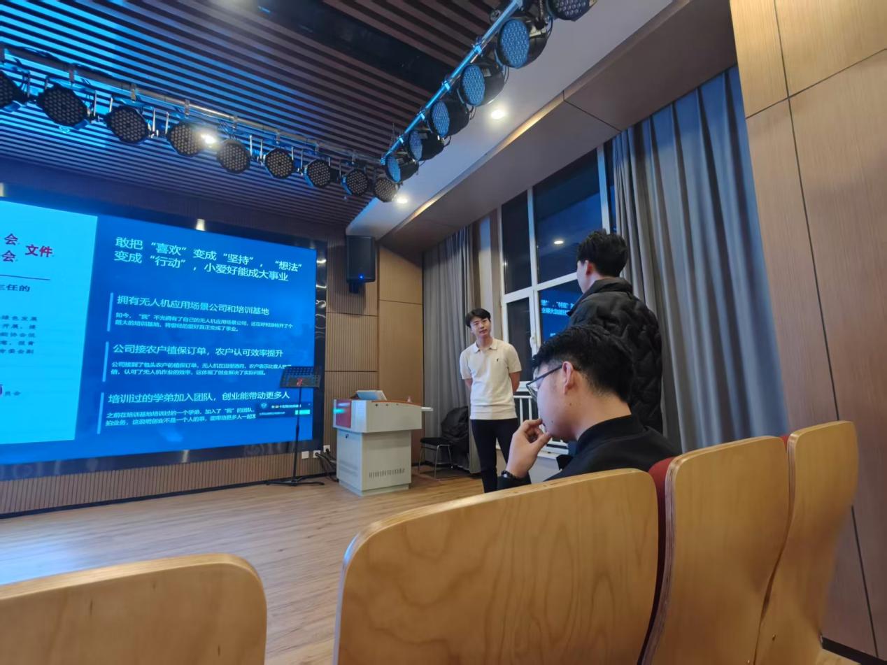 本次交流会特邀2025届舞蹈学专业毕业生王文旗开展创业分享。他从大一接触无人机航拍并产生兴趣,到大二接到首单生意萌生创业想法,再到大四学习SYB课程受启发,深入农户与景区调研后找准“低空经济”落地方向,以“从宿舍摆弄零件到拥有培训基地和公司”的真实创业经历,生动诠释了“热爱”与“坚持”的力量,赢得现场阵阵掌声。